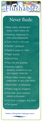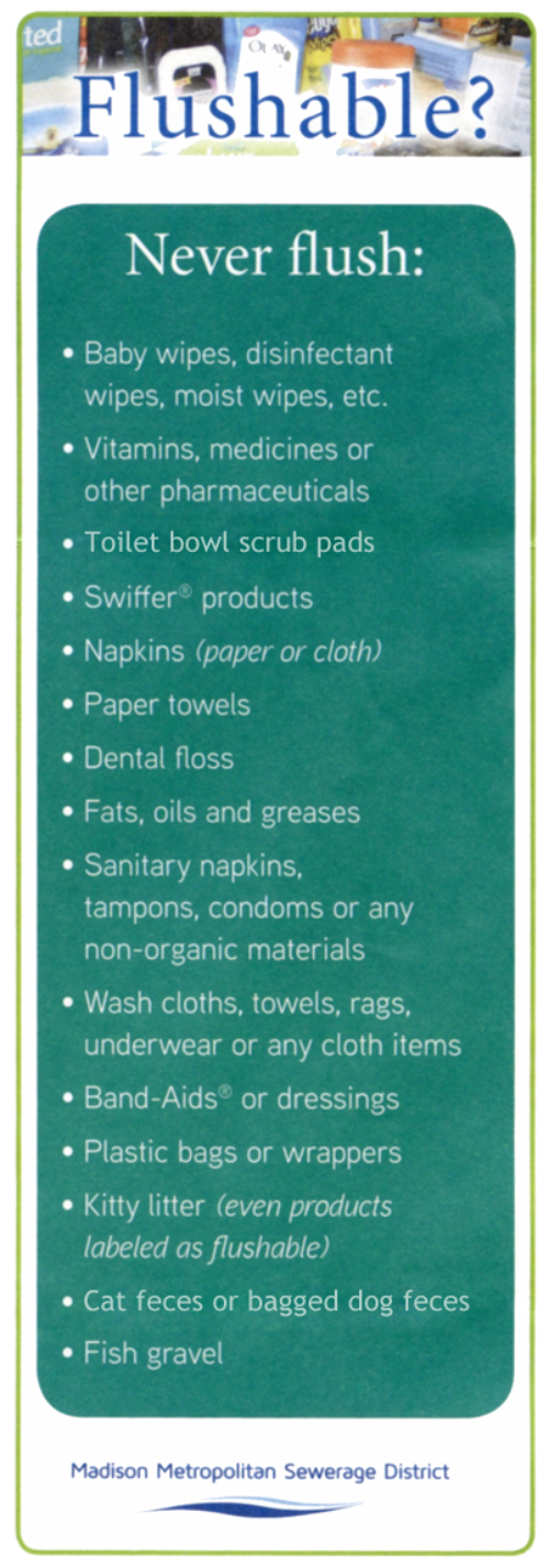 Roto-Rooter ® has been clearing clogged drains since 1935, when Samuel Blanc patented the first electric drain cleaning machine and began the Roto-Rooter ® franchise business. Modern drain cleaning machines still function pretty much the same way, using blades to cut through the debris and restore proper flow. Today Roto-Rooter ® cleans more drains and more sewer lines than any other company in North America. The Roto-Rooter ® name is synonymous with quality service backed by years of experience. Roto-Rooter ® will unclog your drain, recommend a maintenance interval and/or product and provide tips for keeping your drains flowing freely. We are experts at solving all types of drain and sewer line problems: Kitchen drains clog over time. They run slower and slower as greases, soaps, fats and detergents build up on the inner walls of the pipes and eventually cause blockage. A Roto-Rooter ® service technician who specializes in kitchen plumbing jobs will use a Roto-Rooter ® sink machine to cut through the clog and remove all debris. Shower and tub drains present their own challenges. The clog culprit is usually hair and soap buildup in the trap and drainpipe. A service technician skilled in shower repair techniques will use one of Roto-Rooter's tub and shower drain cleaning machines to cleanse the drain of any and all debris, restoring it to new condition. Bathroom sink drains may become clogged with hair, toothpaste, soap and grime. Roto-Rooter ® provides many bathroom plumbing solutions and sink drains are one of the more common problems we solve. Roto-Rooter will remove the clog and thoroughly clean the entire pipe so your sinks will drain like new. Toilet drains are sometimes overwhelmed with toilet paper and even the occasional kid's toy. Roto-Rooter ® can solve the problem with a Roto-Rooter machine that feeds a spinning cable into the toilet drain. The cable has special spring loaded blades on the tip that will cut through any obstruction while hugging the inside wall of the pipe and thoroughly cleaning it to restore full drainage and powerful flushes. Floor drains are common in basements, laundry rooms and garages. They may also be found on patios and driveways as well as older bathrooms. These drains are equipped with a trap that should be kept filled with water to prevent odors and sewer gas from escaping. You should test drains occasionally to make sure they are aren't clogged and are ready to carry away water and prevent flooding. Dirt and debris can clog floor drains but Roto-Rooter ® can open them quickly to restore good drainage. Downspout drains help to channel water from roof gutters away from your home. Many downspouts are connected to the city's storm sewer system via underground pipes which can become clogged with leaves and debris and cause a backup. Roto-Rooter ® provides professional sewer and drain services that clean downspouts and their connecting pipes to prevent flooding and restore proper drainage around the home. And finally, Madison Metropolitan Sewage District answers the question; What’s Flushable?